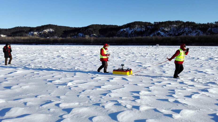 2015年12月,大連中睿科技發展有限公司與中國水利水電科學研究院合作,采用中睿科技創新研發的IGPR-10型冰厚水深綜合探測雷達,在我國北方的河流黑龍江漠河北極村段,成功進行了冰封河流冰厚水深連續綜合探測,開創性地獲取了高精度河流連續冰厚水深雷達圖像。通過沿河流中宏線、河流中宏到河岸橫斷線進行的10千米測線的探測作業,IGPR-10型冰厚水深綜合探測雷達性能表現優異,冰厚水深探測結果準確,作業快捷,并能夠同步精確坐標定位,可在-30度環境下穩定可靠工作。這一創新高新技術成果為河流冰情基本觀測、河流凌汛預防預警和凌汛爆破排險提供了先進的設備和手段。
